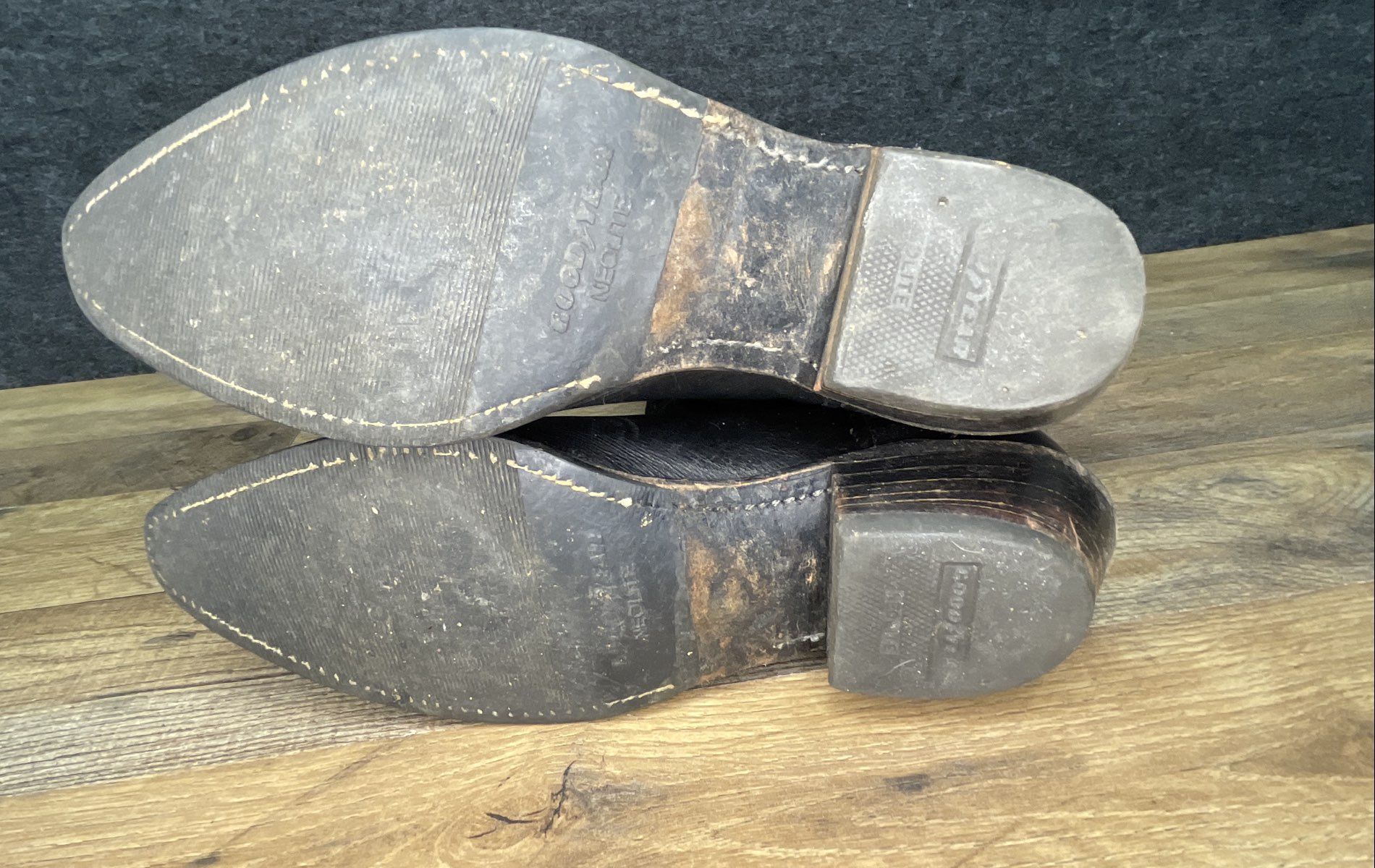 Condition: Good pre-owned condition. The boots show moderate to heavy signs of wear consistent with age. There is noticeable scuffing and material wear on the pointed toes. Uppers have creasing across the vamps. The outsoles exhibit significant wear, and the heels show some drag. Interiors are in fair shape. Please see all photos for a detailed depiction of condition.