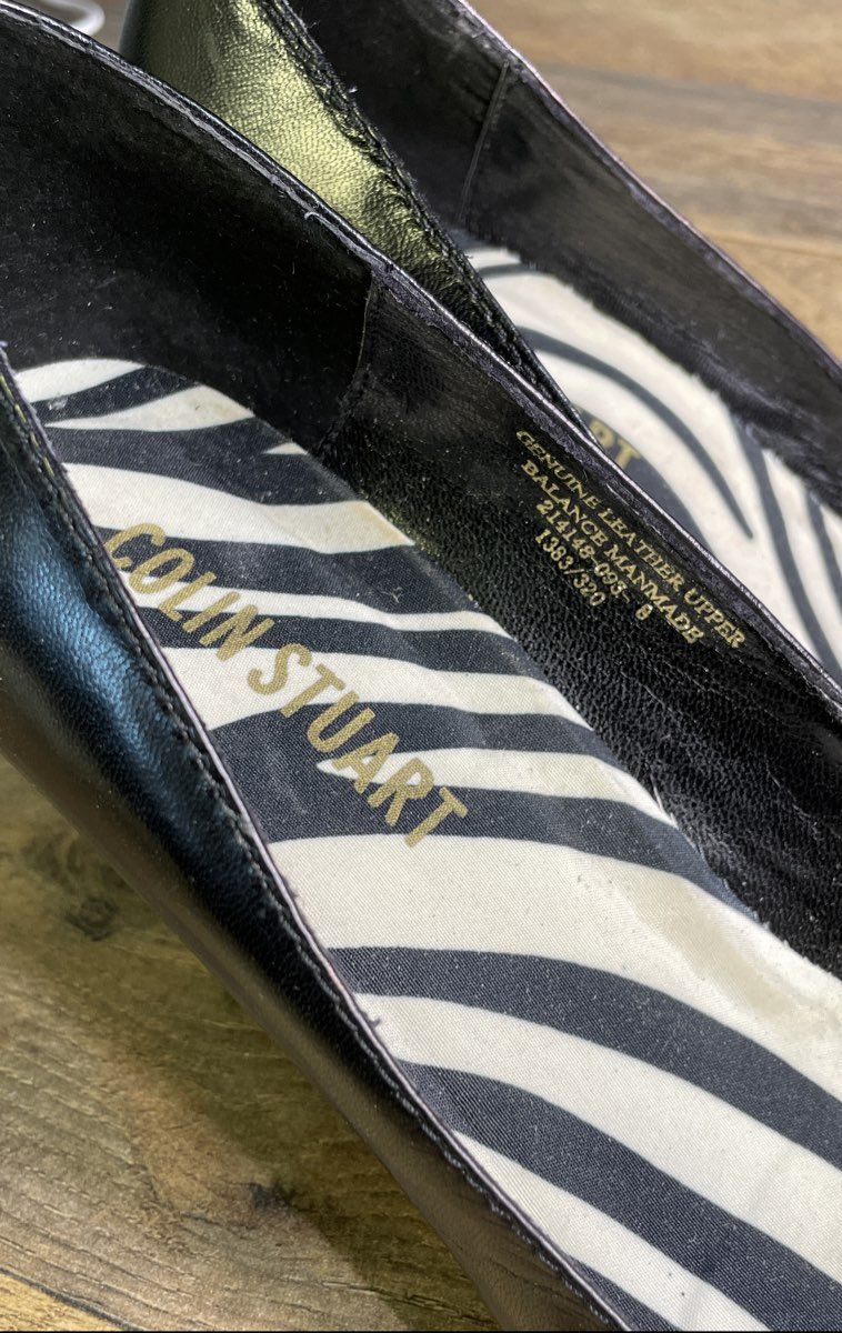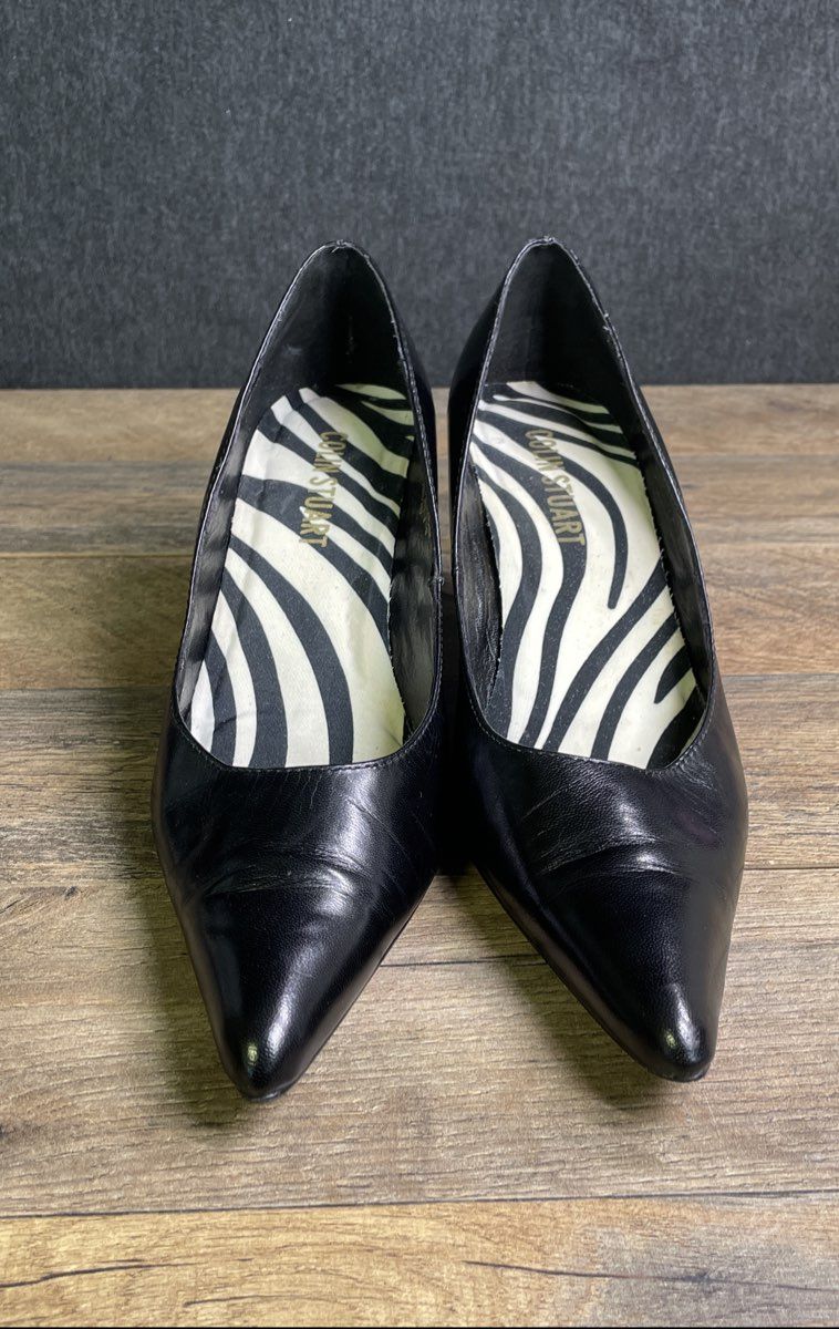 A classic pair of Y2K-era pumps from Colin Stuart. These heels feature a genuine black leather upper with a sharp pointed toe and a sleek stiletto heel. The interior reveals a bold zebra print insole, a signature touch of early 2000s fashion. A versatile style perfect for the office or a night out, capturing a distinct retro aesthetic.