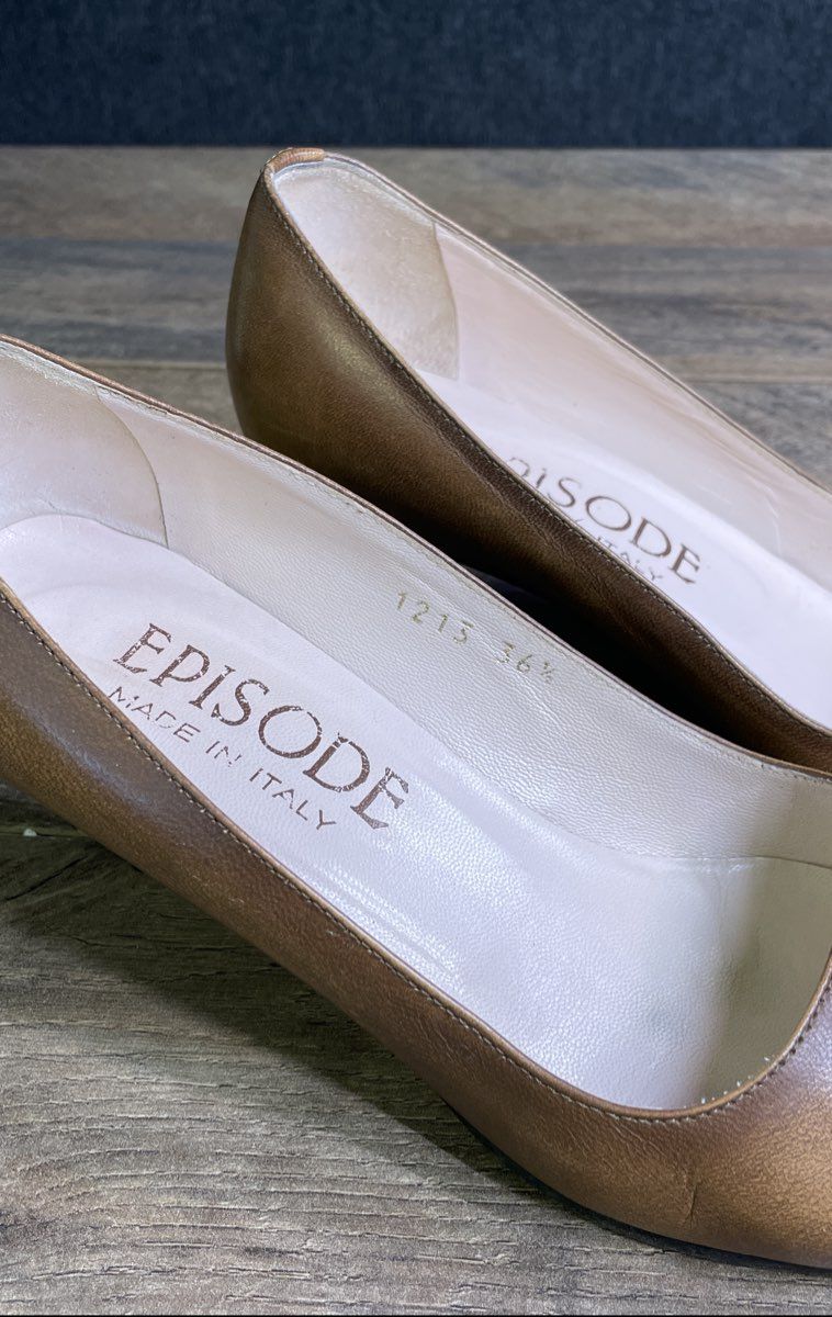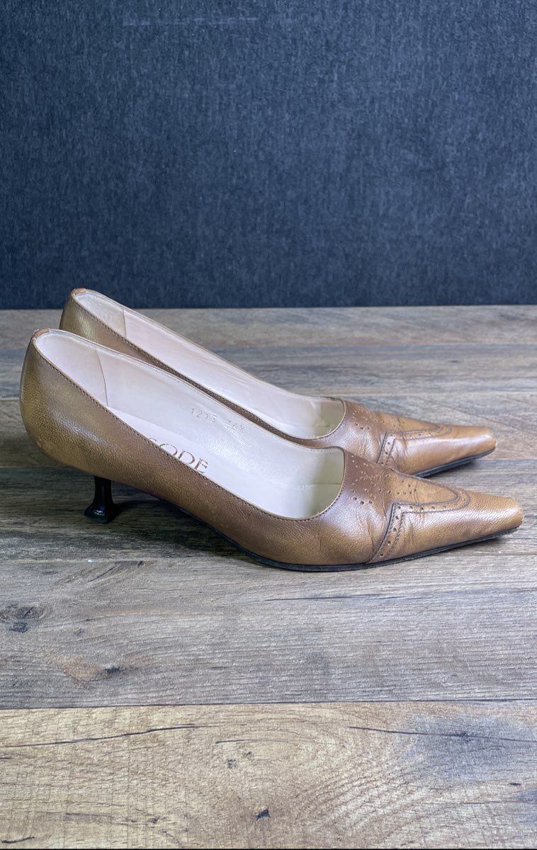 Vintage Y2K Episode Brown Leather Brogue Pointed Toe Kitten Heels Italy Sz 36.5