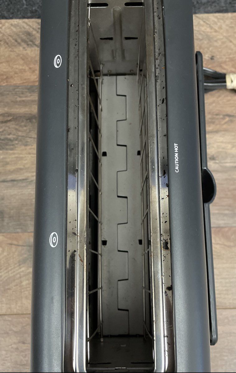 Condition: The toaster is in used condition. The exterior casing shows some light surface scuffs and marks consistent with previous use. The interior toasting slots show visible crumbs and scorching, as pictured. The power cord is intact.