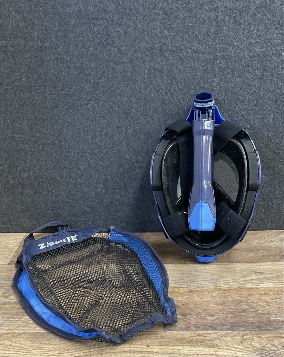 This is a Z/POUTE full-face snorkeling mask designed for surface-level underwater exploration. The large, single-piece lens provides a 180-degree panoramic field of view. It features an integrated dry-top snorkel system intended to prevent water from entering the tube when submerged. This mask comes with its original branded mesh carry bag and a small accessory pack.